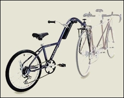 de aanhang-fiets De aanhang-fiets is een fiets zonder voorwiel. Hij bestaat uit een frame met achterwiel, zadel en stuur maar waar het voorwiel zou moeten zitten gaat een stang naar voren die bevestigd wordt aan de zadelpen van de fiets van een ouder. De ouder stuurt dus eigenlijk en het kind hoeft niet op het verkeer te letten. Het voordeel van deze fietsjes is dat het kind zelf moet fietsen en z'n evenwicht bewaren, het is voor de motoriek en gevoel voor evenwicht gunstiger dan een tandem. (hier hoeft het kind alleen maar te trappen). Deze fietsen zijn te koop bij de gewone fietshandel al vanaf ongeveer fl. 300,-. Ze zijn er in verschillende groottes, met en zonder versnellingen.